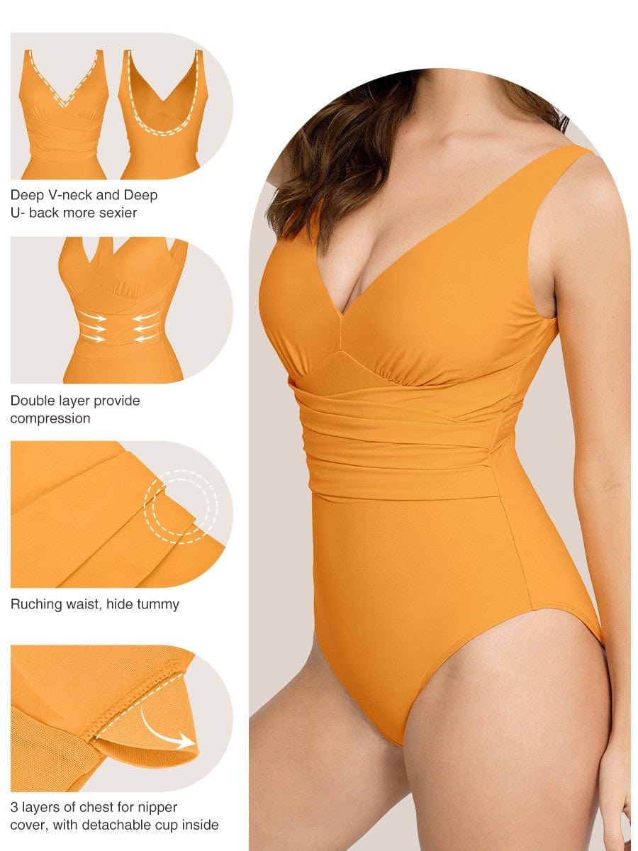 Turn heads with this chic one-piece swimsuit that combines bold design and figure-flattering details. A dramatic deep V-neckline and asymmetric one-shoulder silhouette create a modern, stylish look, while pleated waist detailing visually slims and enhances curves. With built-in shaping mesh and removable cups, it offers flattering support and confidence-boosting comfort for beach days, poolside lounging, or resort wear.